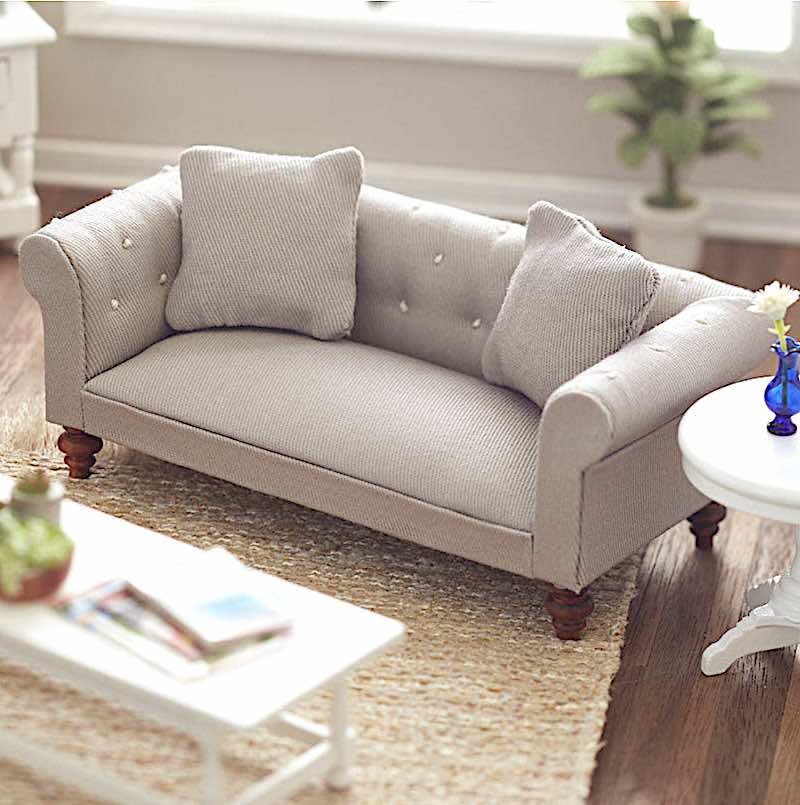 En stilfull soffa i grå textil med svarvade träben och två prydnadskuddar. Mått ca H 6 x B 15 x D 5 cm. Bild två visar med kuddar.