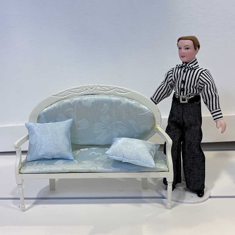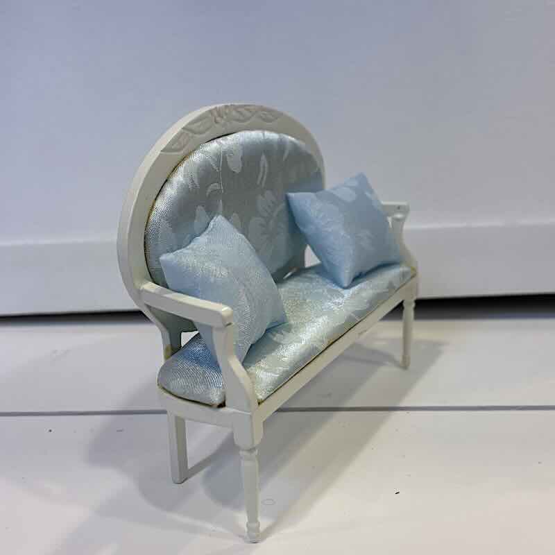 Vacker soffa i sekelskiftes-stil, tillverkad i creme-lackerat trä med ljusblå textil. Mått ca B 14 cm x H 10 cm. Förekommer små limrester vid limning av textdelar på ngt ställe, vilket återspeglas i priset.