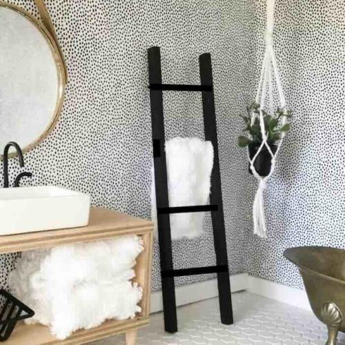 En stege för dina miniatyrprojekt. Snygg som för handdukar i badrum t ex. Tillverkade i svartlackerad plast. Mått 12 cm. Idébild nedan på hur du kan använda den i ett badrum (inte exakt samma stege dock)