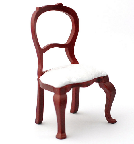 Vackert detaljerad stol matsalsmöbel. En mahognylackerad stol i trä med stoppad dyna i vitt brokadtextil. Mått ca H 8,5 cm, sitthöjd ca 4 cm