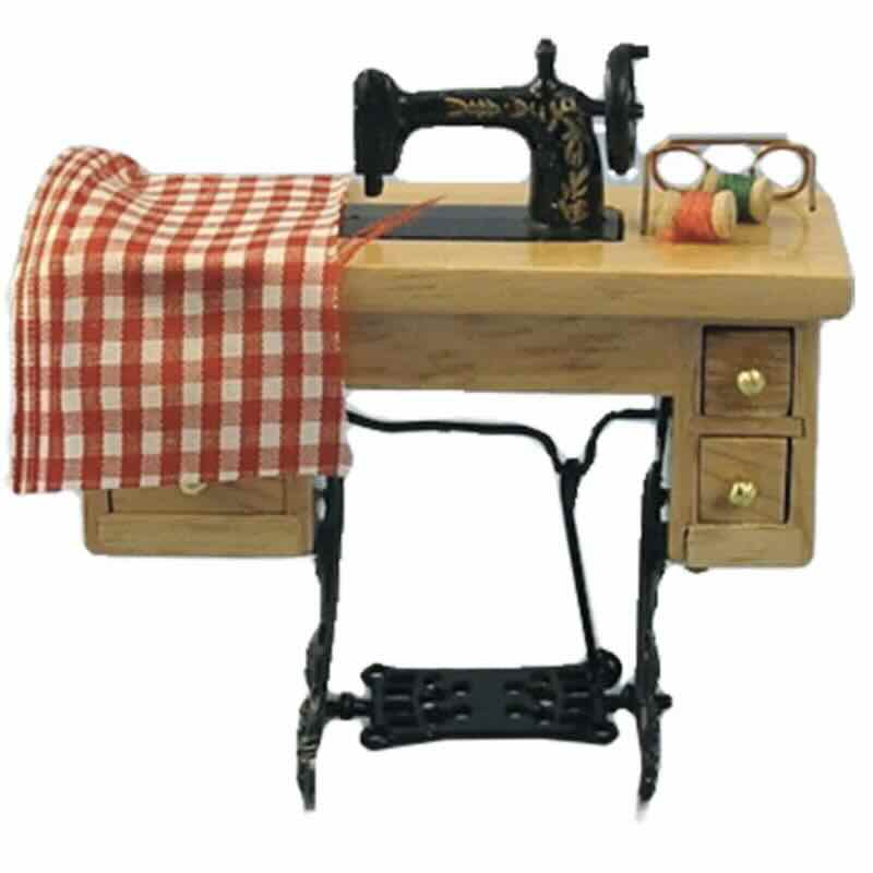 Symaskin där arbetet är i full gång med textil som sys, ett par glasögon och en trådrulle ligger på bordet. Öppningsbara lådor. Tillverkad i trä och metall.