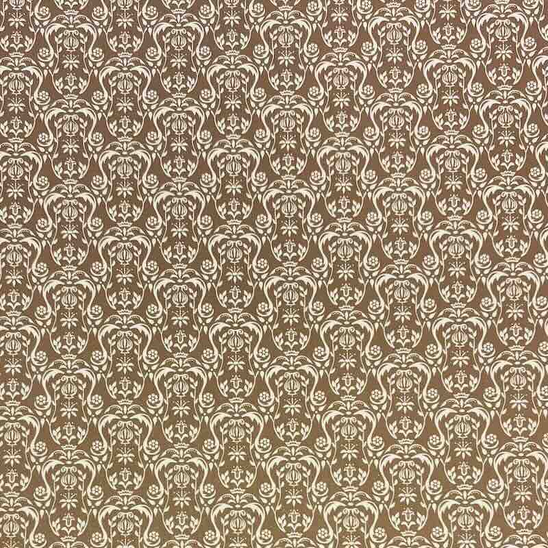 En vacker tapet i klassisk stil, med stiliserade urnor i creme på brun botten - lite mörkare brun än vad som syns här. Mått arket ca 43 x 31 cm. Monteras med tapetklister.