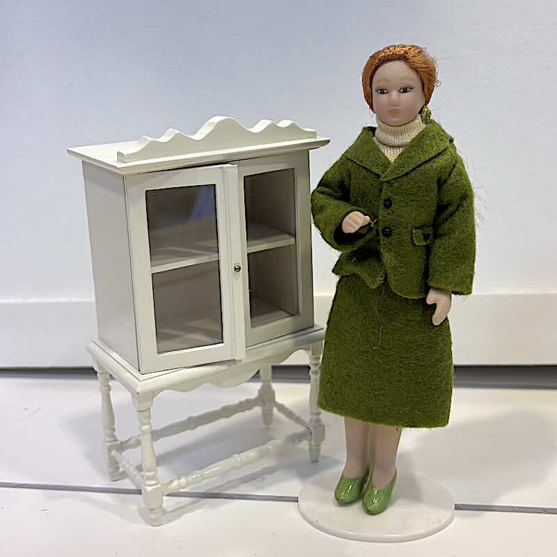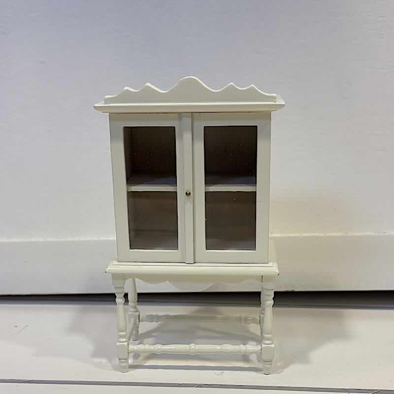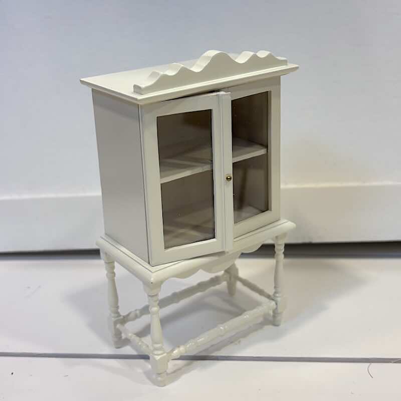 Nätt litet vitrinskåp i vitlackerat trä med öppningsbara dörrar och fina detaljer. Mått ca H 13 cm x B 8 cm.