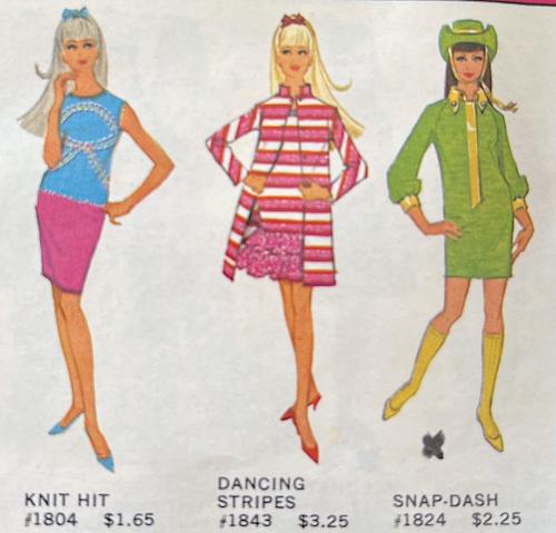 Mod Barbie Flip hair: Blond i #1824 Snap Dash, Brunette i #1843 Dancing Stripes och ytterligare en Brunette i #1804 Knit Hit. Dessa plagg från 1968.