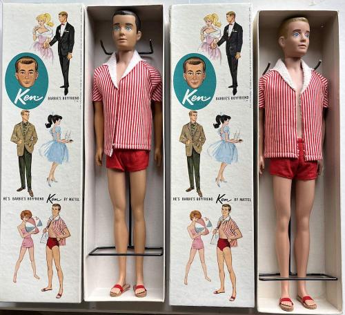 #4224 Mod Hair Ken från 1973 i originalversion till vänster och sedan med variation på kavaj. Därefter #9343 The Now Look Ken från 1977.