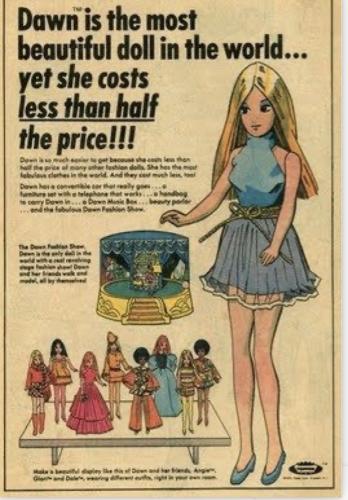 << Dawn-dockorna konkurrerade med dyra Barbie. På grund av det lägre priset på Dawn-dockor var det lätt för kunderna att få en relativt stor samling för en liten peng.