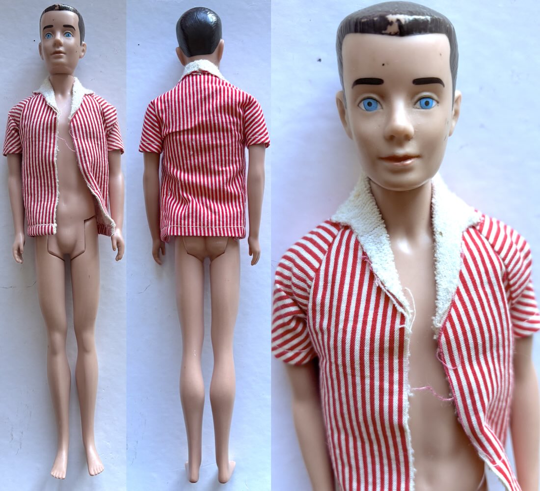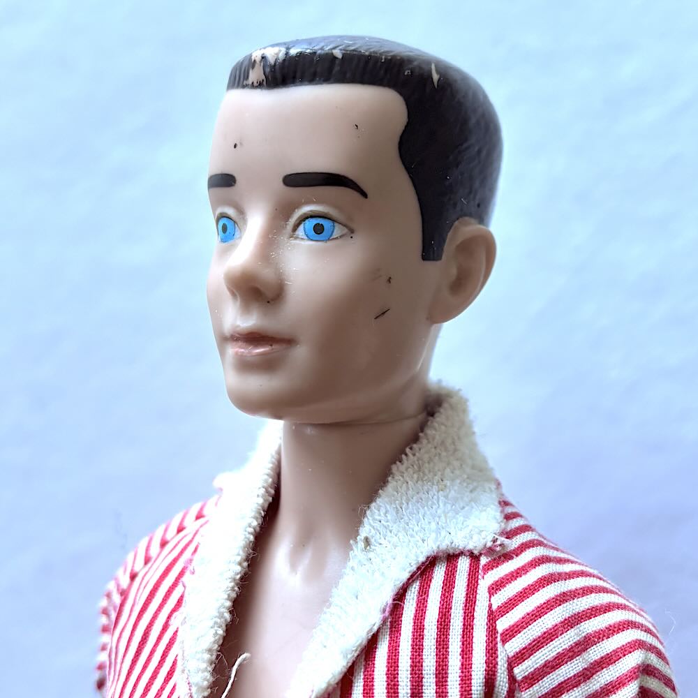 Stilige SL Ken brunett #750 från 1963 (g) i lekt skick. Litet skav på luggen, några små svarta fläckar i ansiktet (har ej provat ta bort dem)- se bild, för övrigt inga skador eller fel vad jag kan se. Kommer i original topp/skjorta. Korrekt märkt och Japan på foten. Ken, Allan mfl hittar du här + fler kläder mm >>
