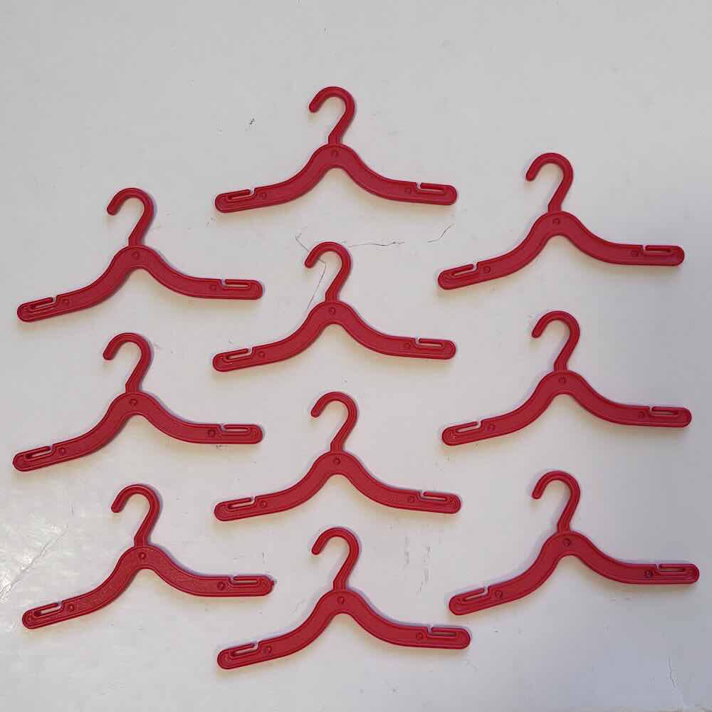 10 st röda galgar som passar för kläderna till Barbie, Tressy, Sindy, Petra och andra fashion dolls.