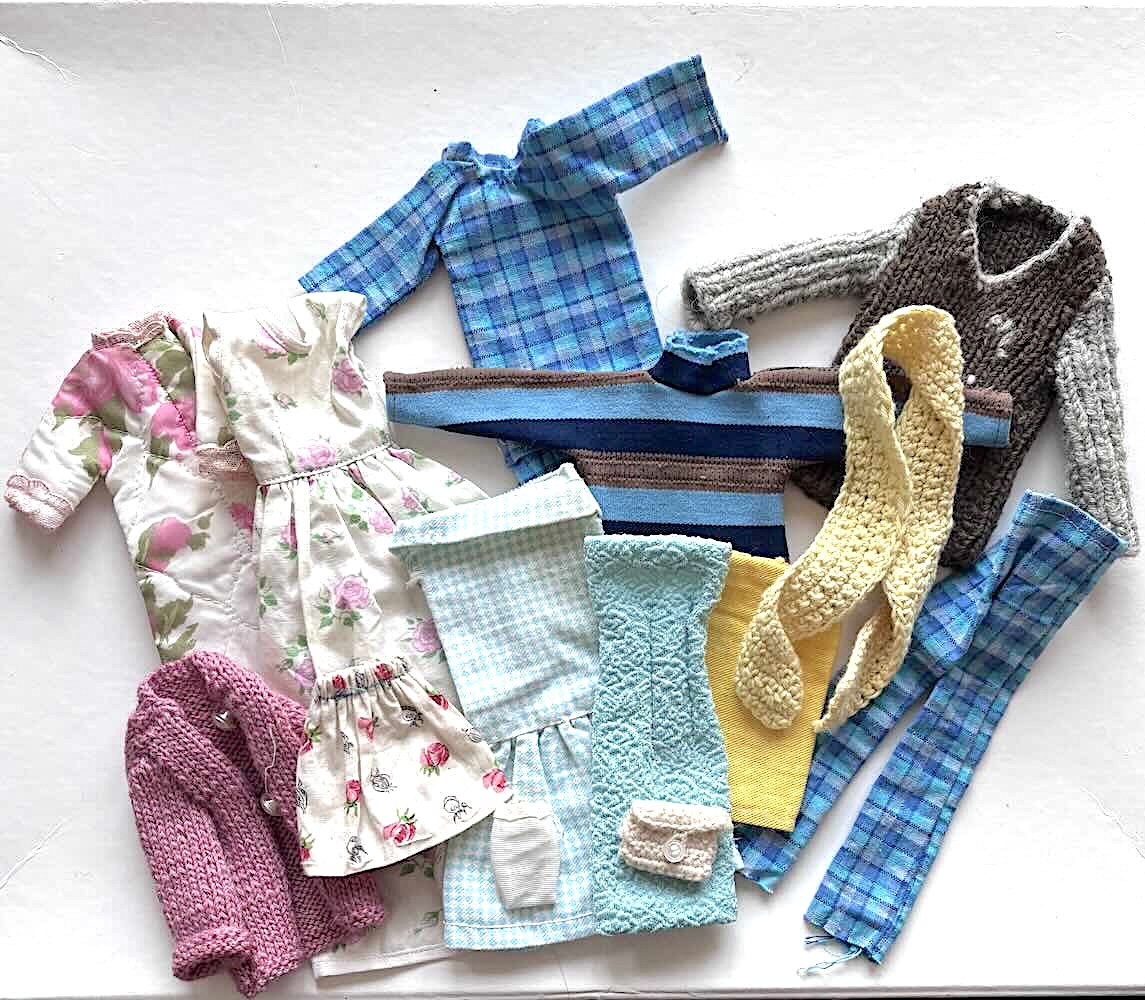 Hemmasydda och -stickade unika plagg o tillbehör till Barbie, Ken och Skipper på 1960-talet. Fint lekt skick. En kul lot!