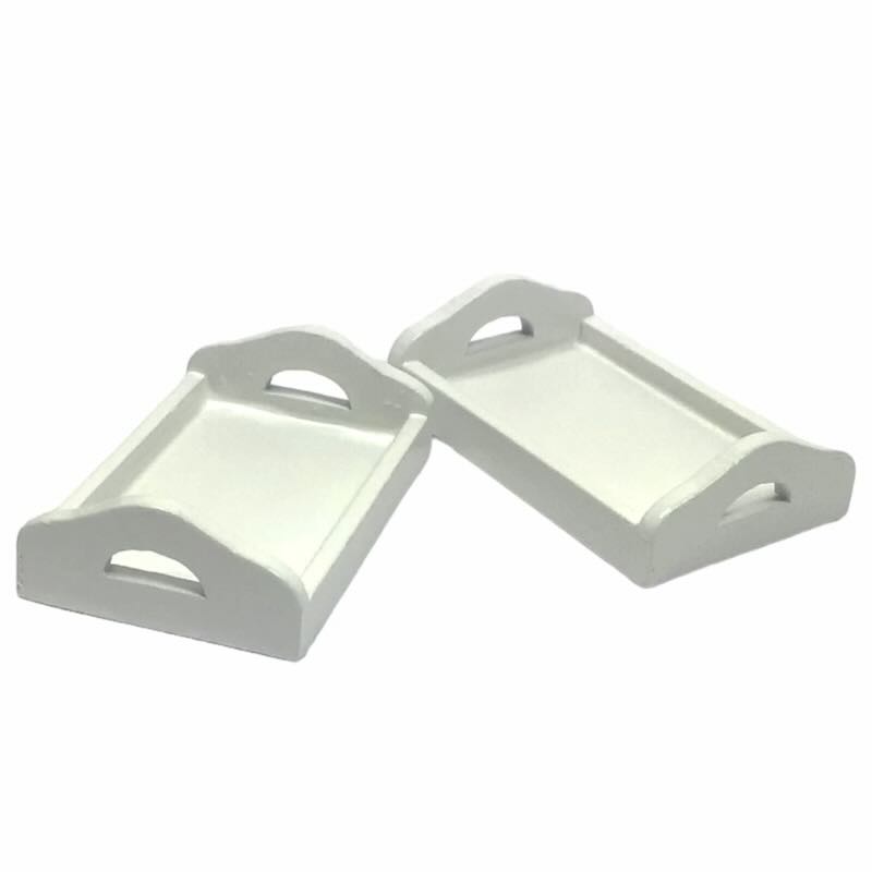 Set med två stycken brickor tillverkade i vitlackerat trä. Mått ca L 5 cm x B 3,2 cm. Fint till både dockhushemmet och det lilla caféet i miniatyr.