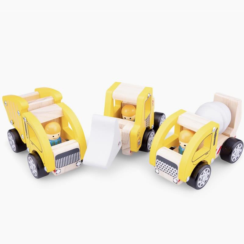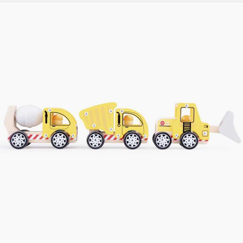 Grävmaskin, dumper och en cementbil i trä. Set med tre bilar tillverkade i bokträ. Rörliga delar. Passar från 3 år. Mått ca: L 16 cm. CE-märkt. Passar från 18 mån