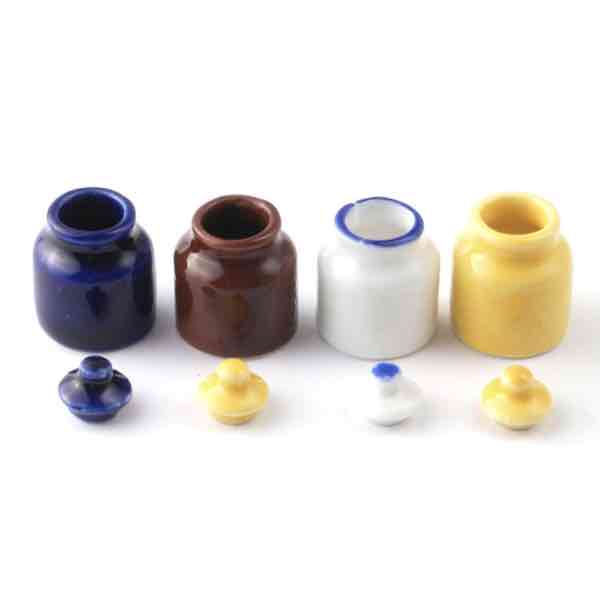 Set med fyra fina porslinsburkar med avtagbart lock. Mått ca H 2,2 cm utan lock.