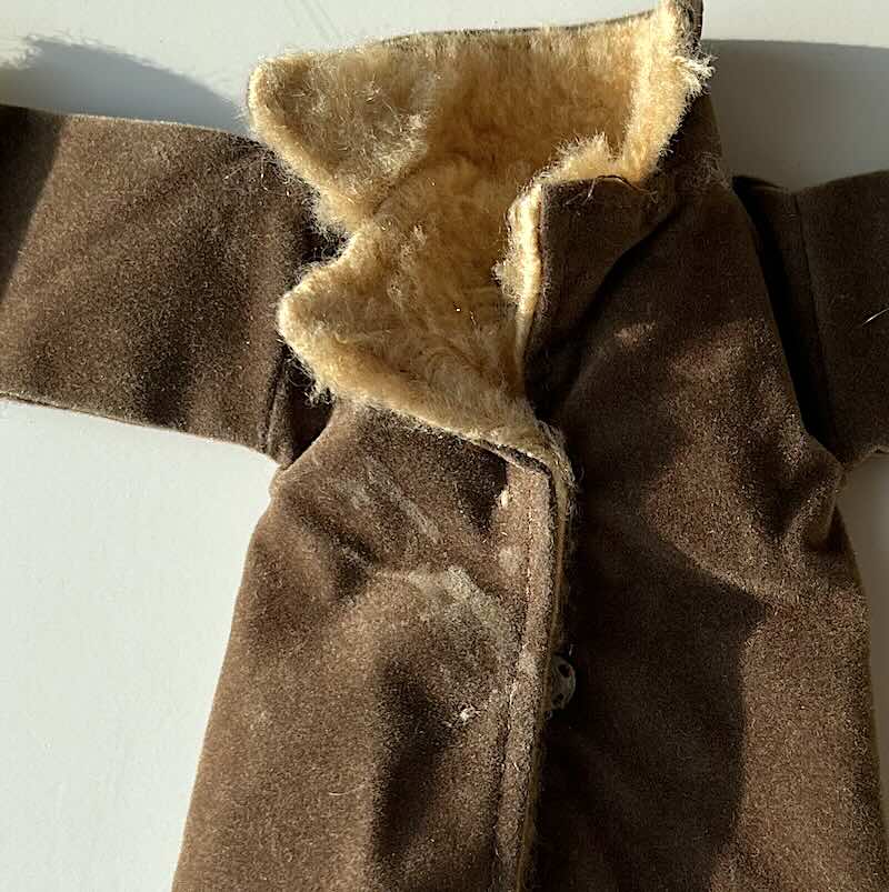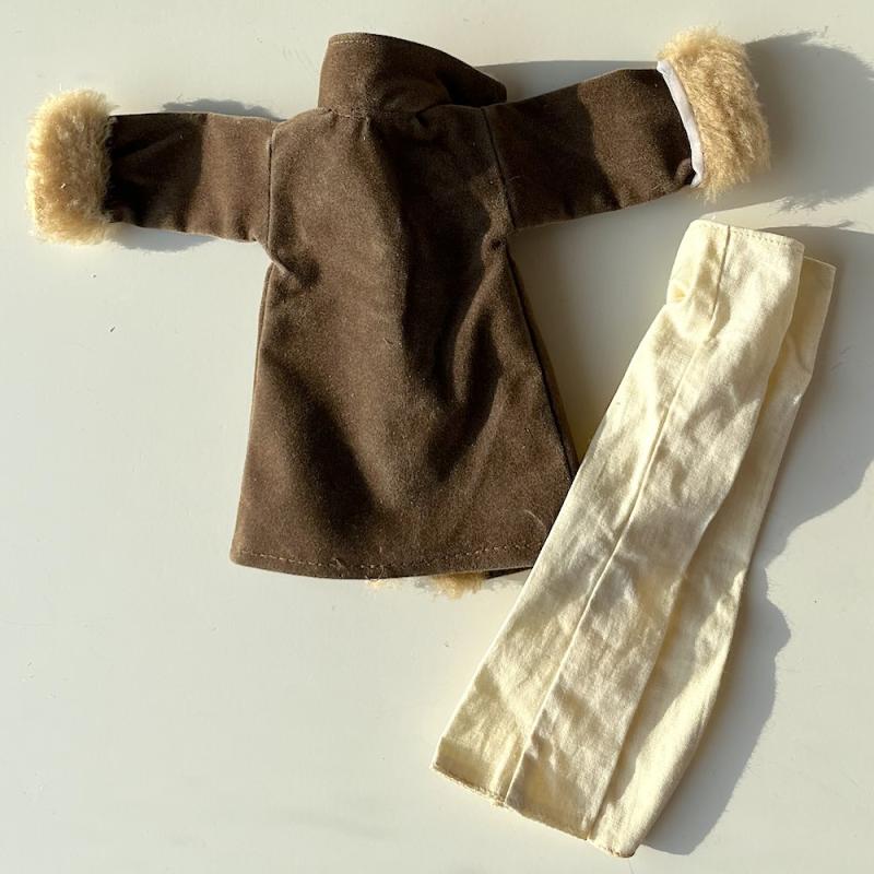 Snygga setet med cremefärgade byxor och cool "pälsjacka". Delarna i fint lekt skick. Jackan med ngn fläck fram - se bild - har inte provat ta bort den.