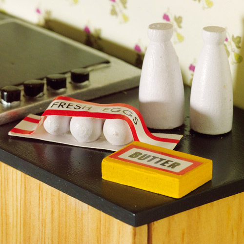 Ett litet set med smör, ägg och mjölflaskor. Mått en flaska ca 2 cm.