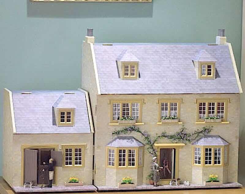 Dockhus i cottage-stil med inspiration från de vackra husen i landskapet Cotswold. Huset har 6 generösa rum, varav två vindsrum. Trapporna är väl placerade i rummen så ytan för möblering blir bra. Även dörrarna inomhus är stilenliga med traditionellt utseende, se bild här nedan. Den nedersta bilden visar huset med tillbyggnaden som är ett stall. Även det går att beställa om du önskar. OBS! Dockhuset kommer omålat så att du själv väljer precis hur du vill ha det - bilderna visar exempel på inredning och dekor. Mått ca H 76 cm x B 72,4 cm x D 41,5 cm.