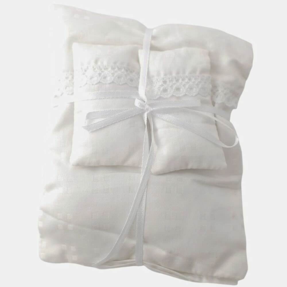 Ett täcke i vitt med 2 st matchande kuddar. Passar sängar i skala 1:12.