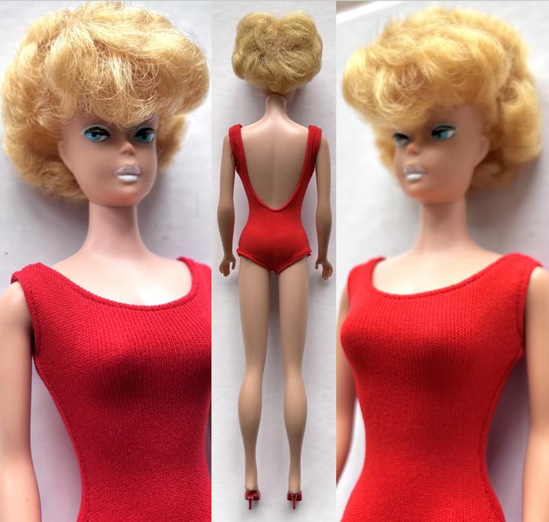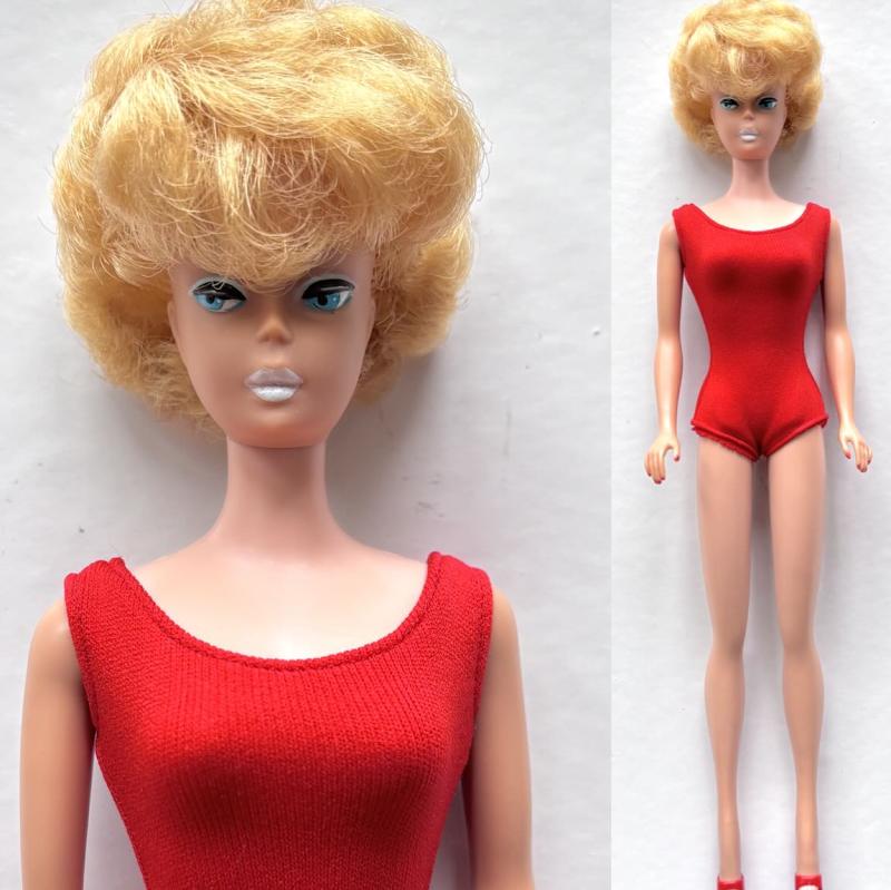 Mycket vacker vintage platinablond bubble cut Barbie. I utmärkt skick. Hål i öronen men inga missfärgningar, 95% kvar av nagellack på fingrar o tår, inget skav på ansiktsmålningen, frisyren stor och härligt bullig - behöver fluffas på baksidan efter att hon legat ned. Rumpan är märkt: Midge T.M. ©1962 Barbie® ©1958 by Mattel, Inc. Patented.
