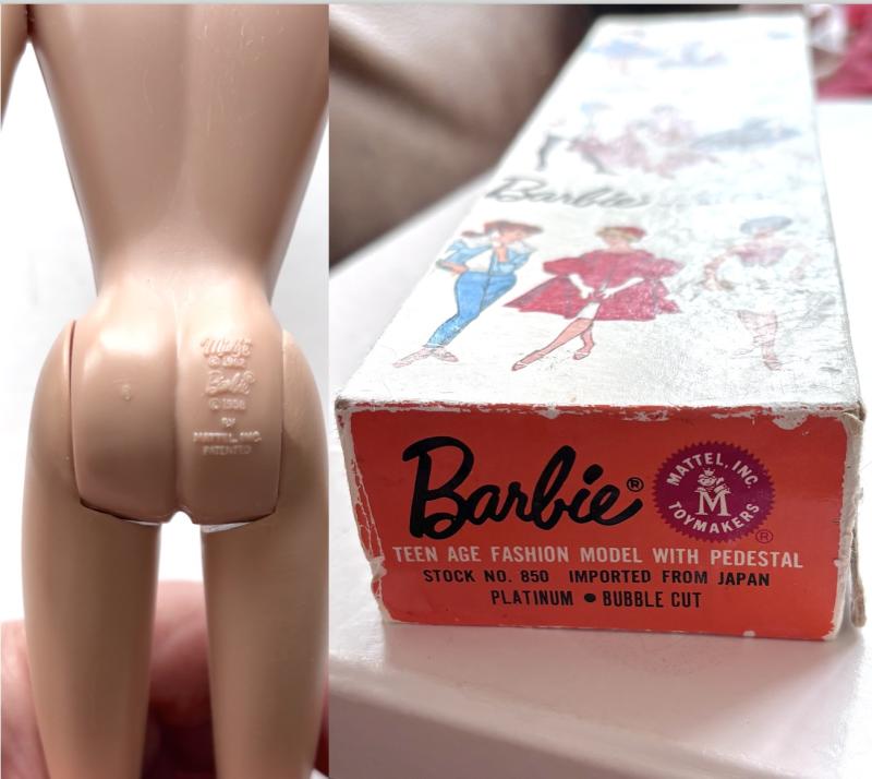 På insidan av hennes huvud står: Copyr. © 1958 Mattel Inc. Vilket visar att hon är en så kallad transitional doll - dockan som kom mellan Bubble cut Barbie och American Girl Barbie och som är ovanlig. Baddräkt fin. Skorna märkta Japan. Box har lite slitage, är trasig i ett av hörnen och kantstötta hörn men helt ok. Studera bilderna för att bilda dig en egen uppfattning.
