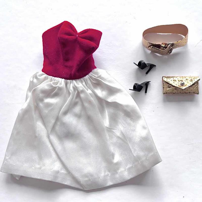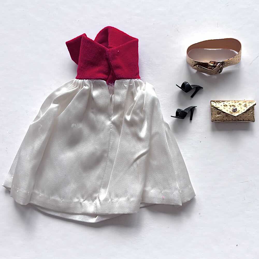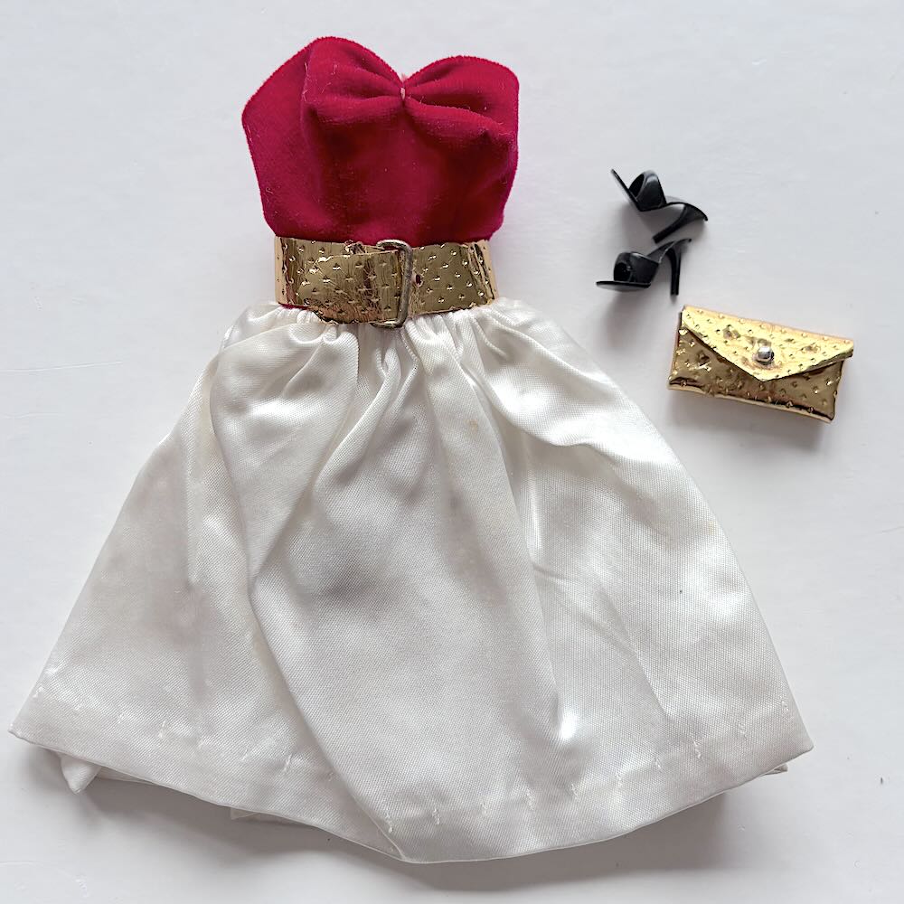 Originalet och ingen reproduktion från 90-talet! Klassiska vintage setet Barbie #977 Silken Flame från 1960-1964 i fint lekt skick. Klänningen vackra färger, guldskärp, guldväska och svarta OT (open toe) skor korrekt märkta Japan. Ett superfint set.