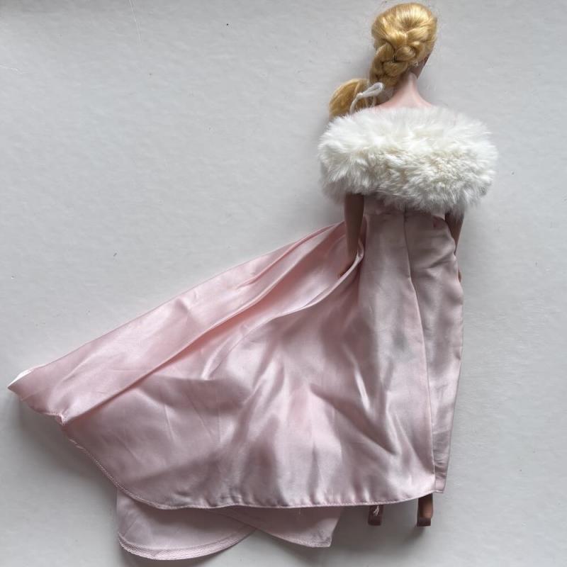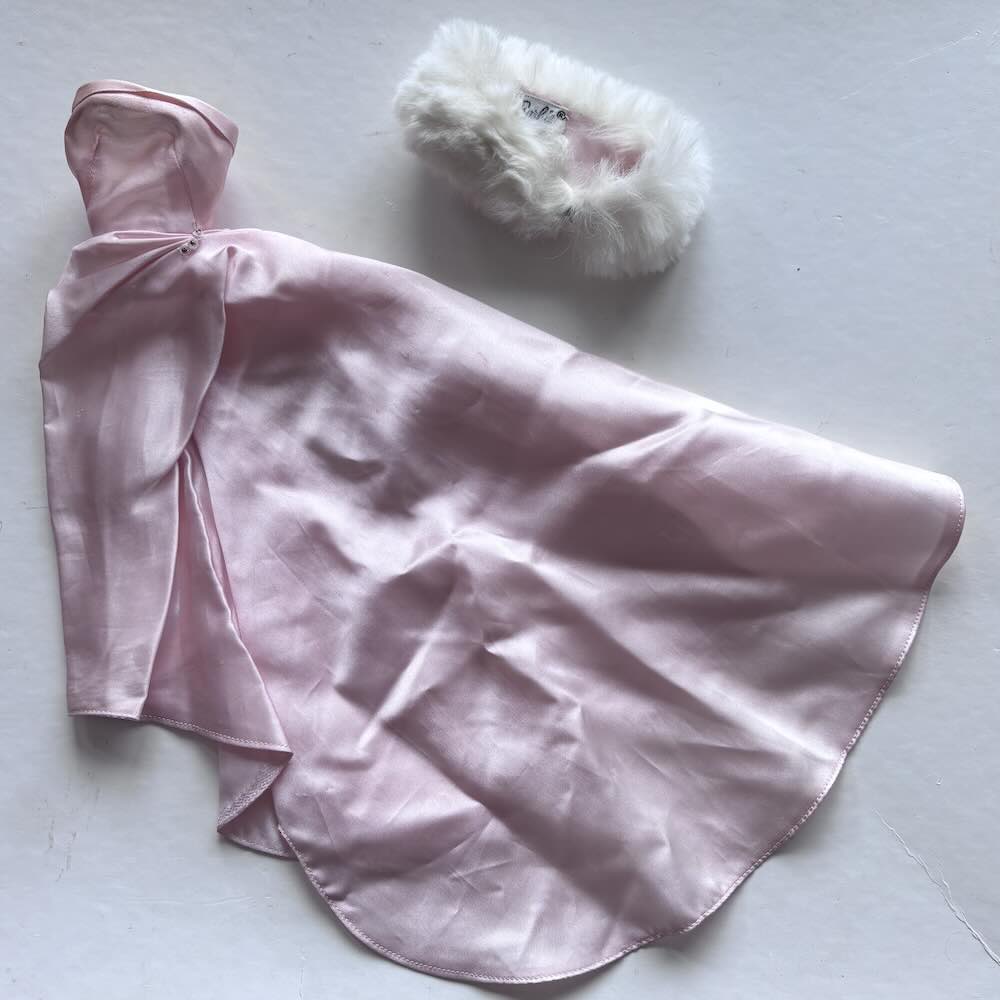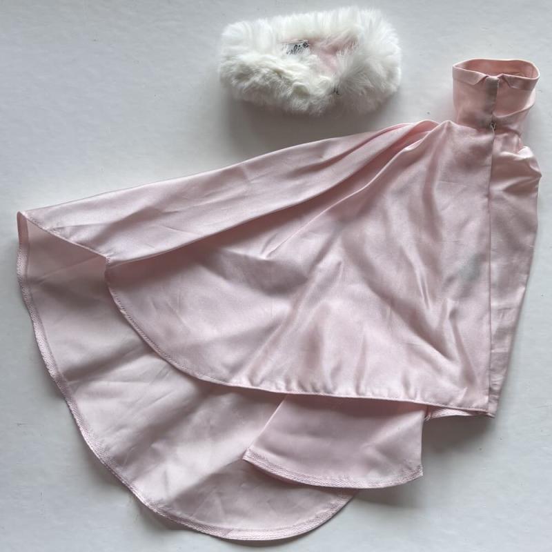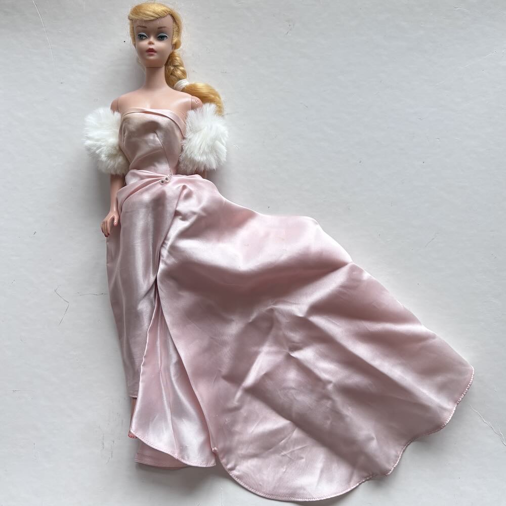 Vackra klänningen och stolan i vit kaninpäls från setet Barbie #983 Enchanted Evenening från 1960-1963 fint lekt skick. Klänningen ljuvt rosa-aprikos med små "broderade diamanter (pärlor)" vid livet och stolan i väldigt fint skick. Inga skador eller fläckar vad jag kan se.