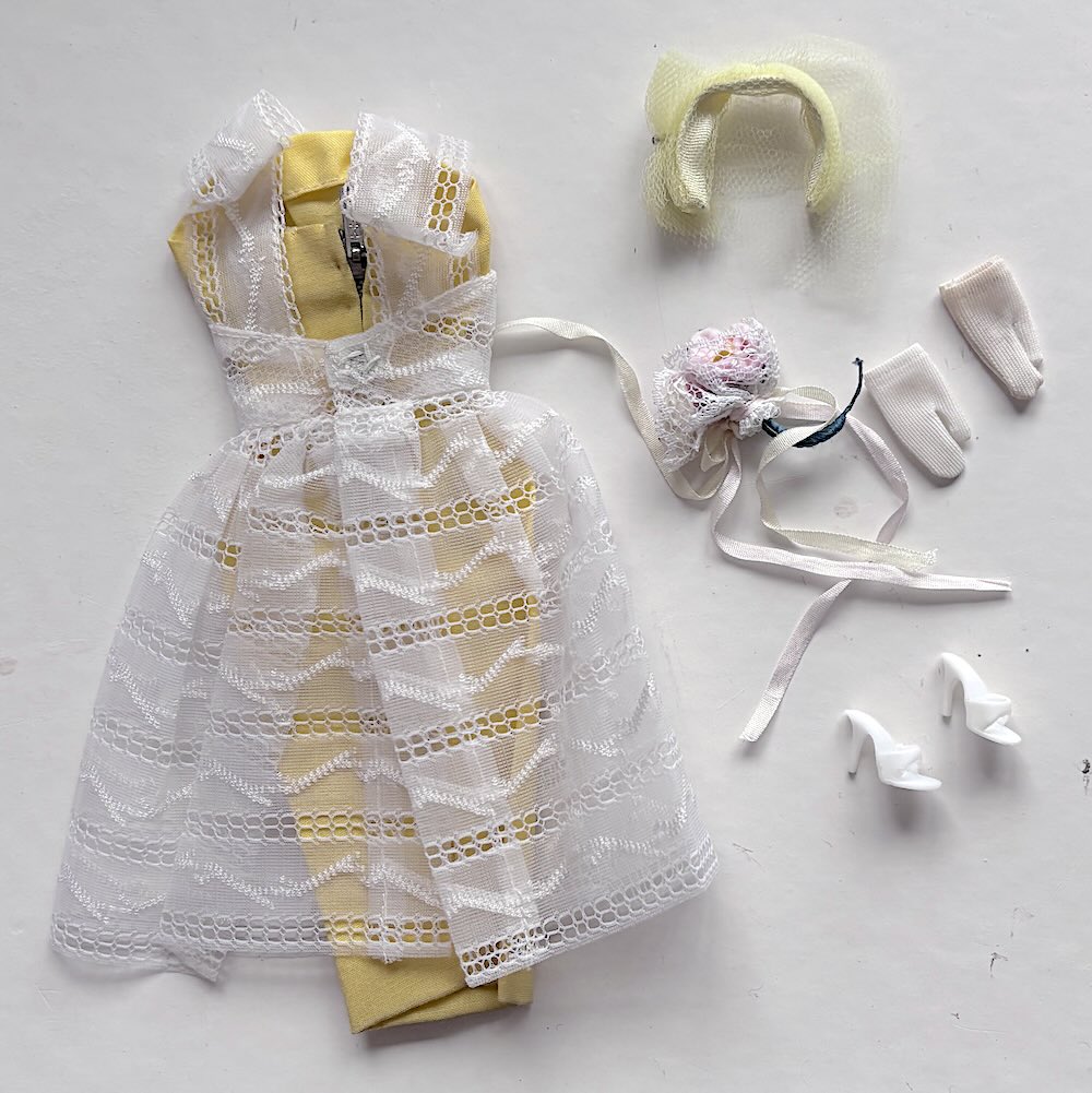 Vackra setet Barbie #987 Orange Blossom från 1961-1964, komplett och i fint lekt skick. De vita handskarna har gulnat något med åldern, men för övrigt fint set.