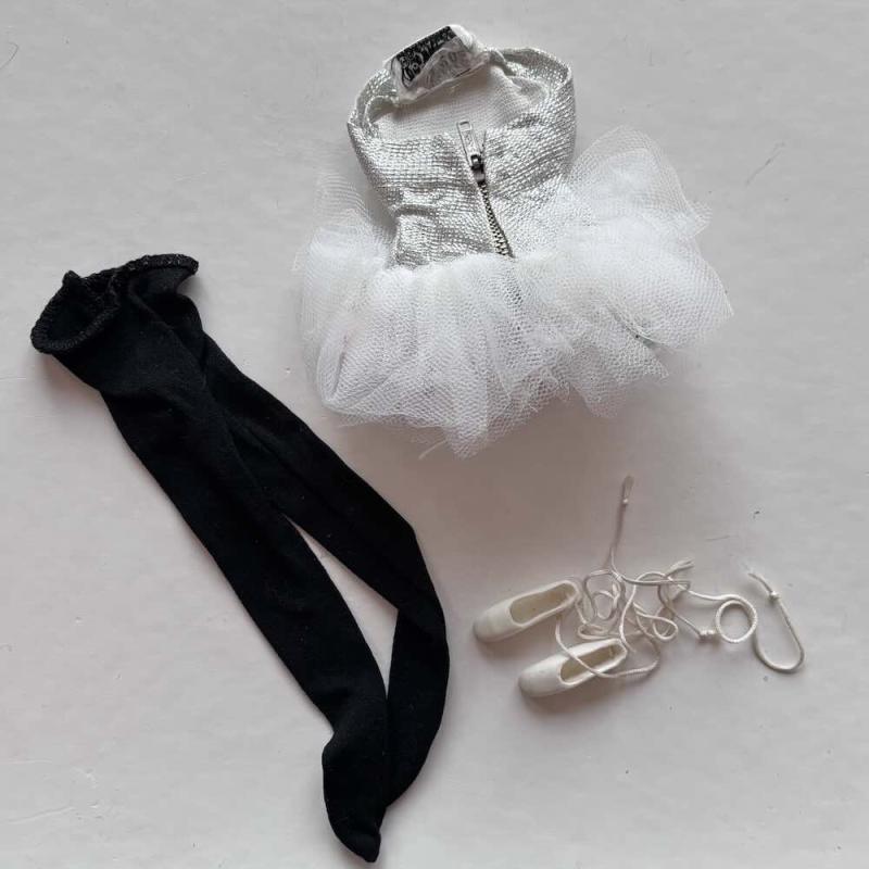 Balettdräkt, ballerinaskor och svarta strumpbyxor med uttänjd resår från 1964. I bra lekt skick.