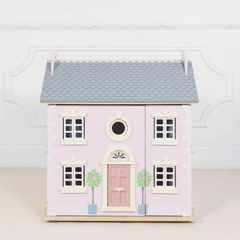 Mycket stiligt dockhus från engelska Le Toy Van. Med två våningsplan + vindsvåning. Öppningsbara dörrar och fönster. Inga möbler eller dockor medföljer. Dockhuset öppnas mitt på.