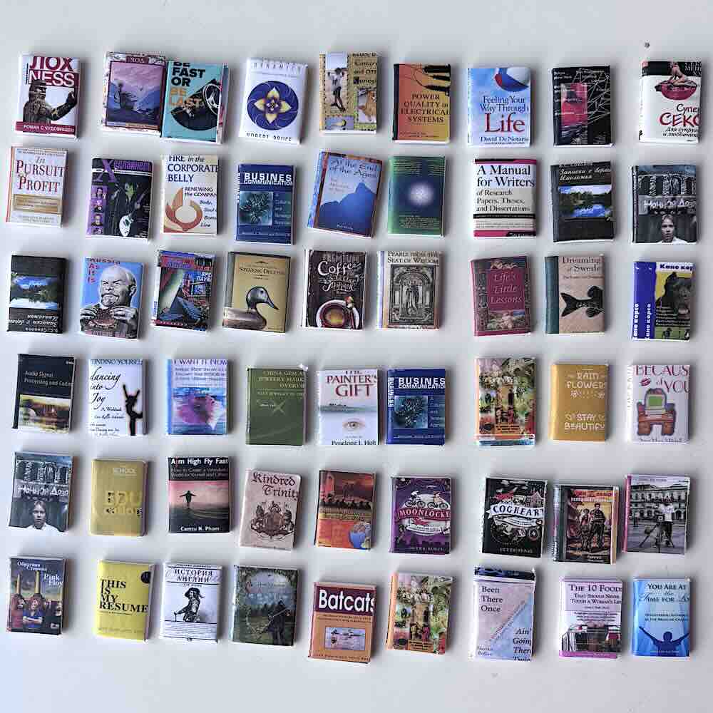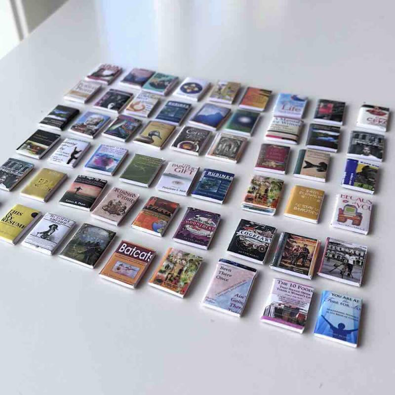 En samling med 9 st osorterade böcker i miniatyr. Inte öppningsbara. Fina att ställa i bokhyllan eller på soffbordet. Du får 9 st slumpartade små böcker. Mått ca 1,5 x 2 cm.
