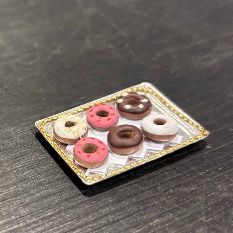 Bakverk med sex stycken donuts med olika "smaksätning" på en bricka i guldfärgad metall. Mått ca L 3,3 cm x B 2,3 cm