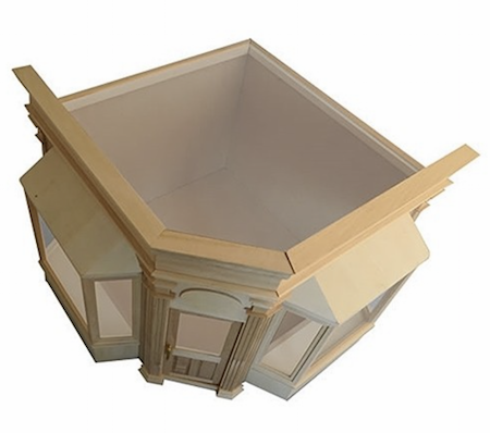 Jättefin detaljerad butik (hörnbyggnad) som tittskåp med plats i skyltfönstren för varor - eller om du vill göra det till ett café eller en bar. Möbleras uppifrån i taköppningen. Skyddas av tunn plexiskiva som genomskinligt "tak". Omålat kit, perfekt som ett litet eget projekt. Färdigt att montera. Mått ca H 27,5 cm x B 34 cm x D 34 cm