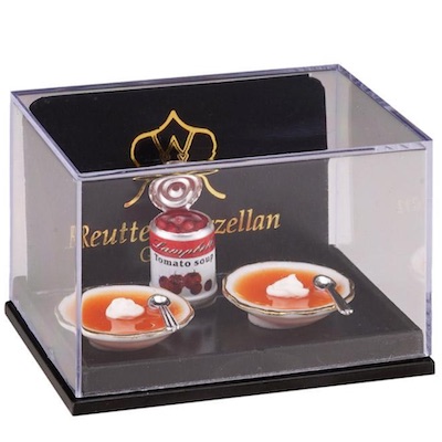 Lyxigt set med en öppnad burk Campbells tomatsoppa och två porslinstallrikar med soppa, en klick creme fraiche och skedar enligt bild. Kommer i fin presentask.