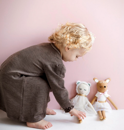 En söt tygdocka, sydd i linne och bomull och stoppad med återvunnen polyfiber. Dockan har broderat ansikte, en vit klänning, guldskor och en liten rosa rosett runt halsen. Mått ca 30 cm. Maskintvätt 30°C (använd tvättpåse).