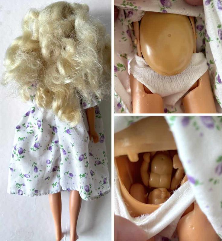 Söt gravid mannekängdocka (i samma storlek som Petra/Sindy/Barbie) med baby i magen. i fint lekt skick utan synliga skador, håret i originaluppsättning (kan behöva friseras något) och klädd i originalkläder. I lättare plastmaterial. Magen öppnas och däri ligger en liten baby.
