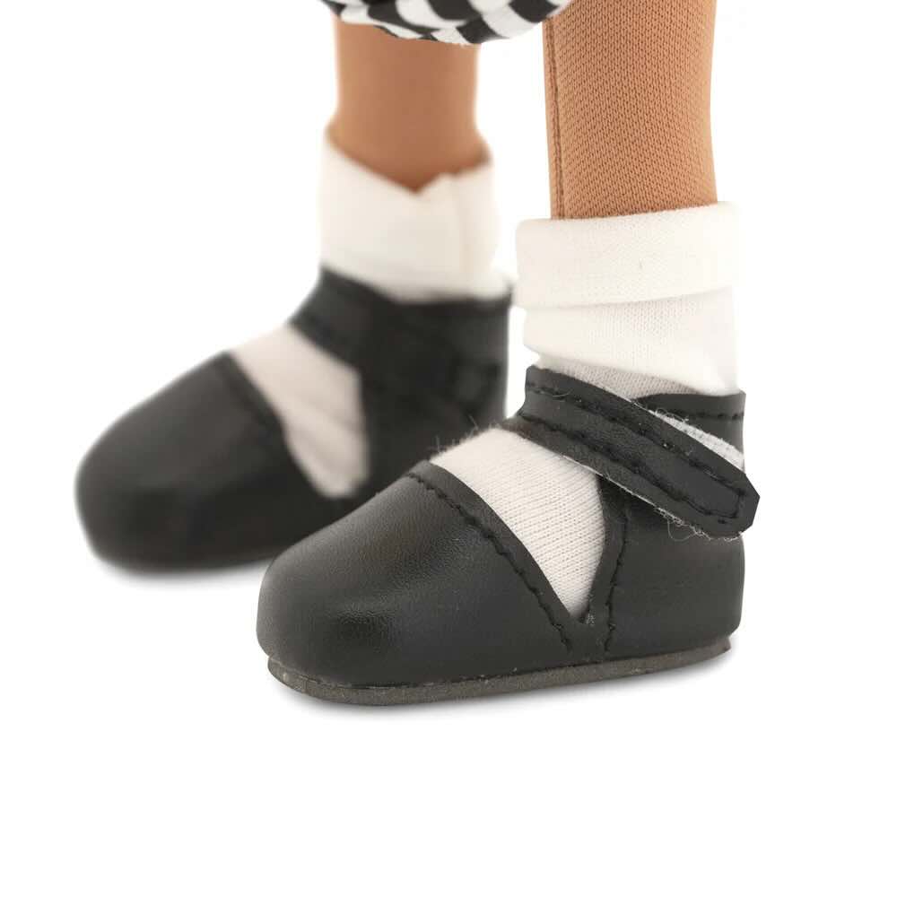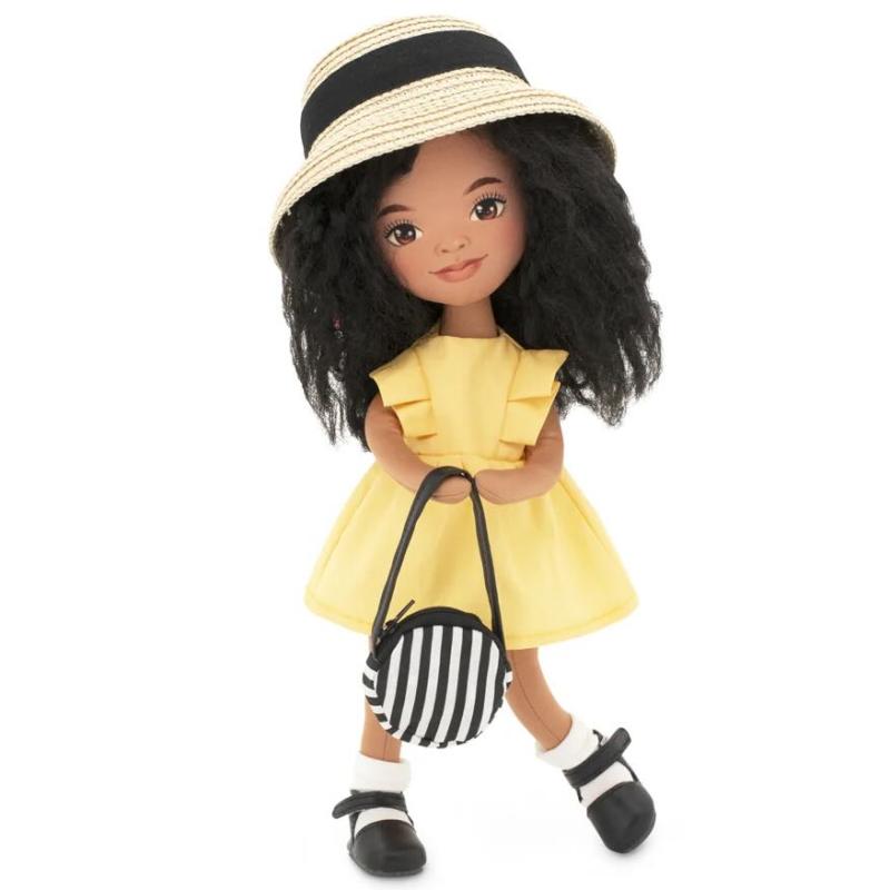 Tina är klädd i en vacker gul sommarklänning med fina detaljer, tillsammans med en flätad solhatt, vita strumpor, svarta sandaler och en snygg randig handväska. Både kläder och skor kan tas av och passar alla dockor i serien.