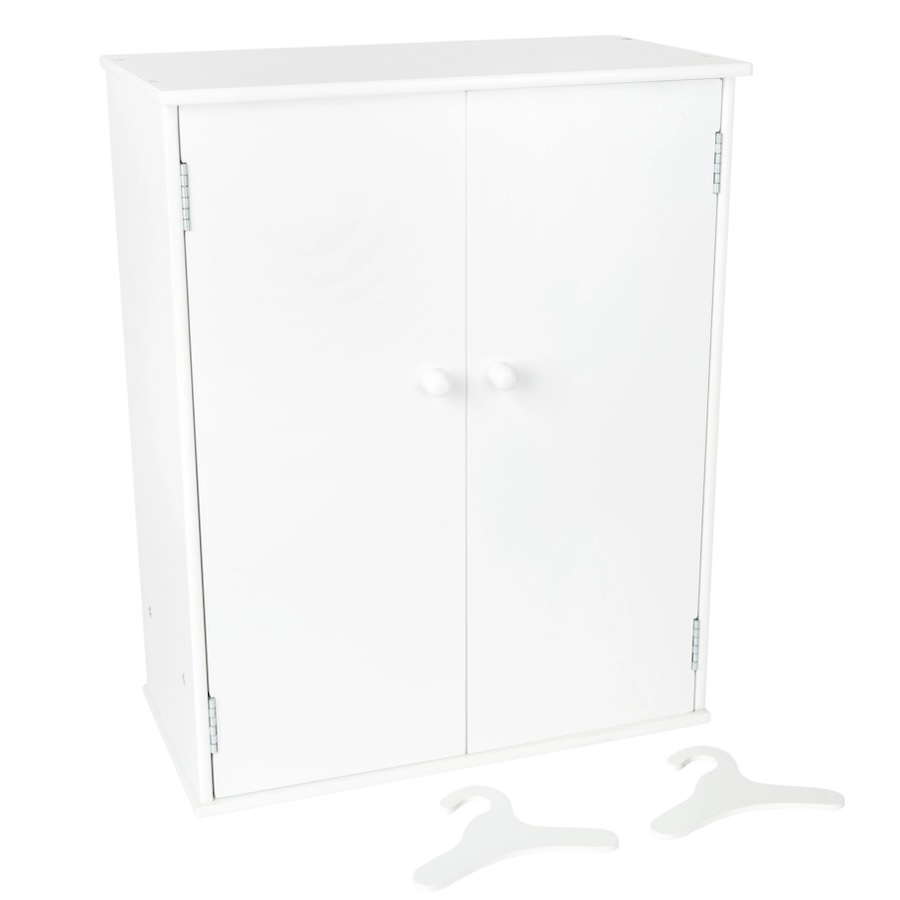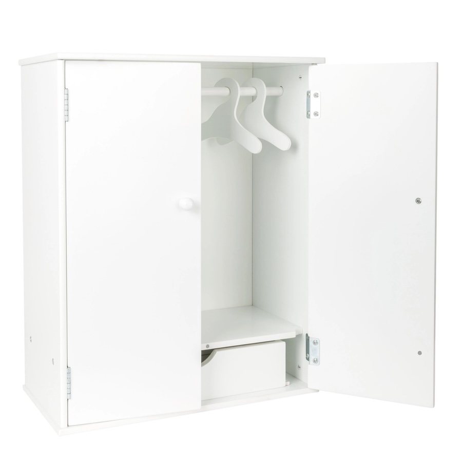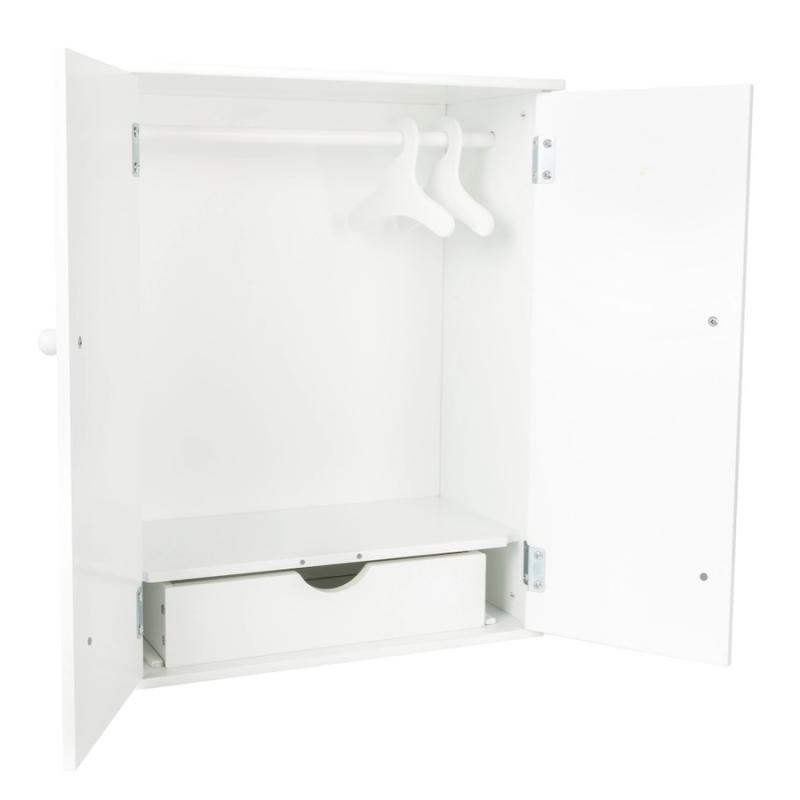 Snygg garderob i vitt trä med plats för många av dockornas plagg. Öppningsbara dörrar och en låda längst ned för detaljer och vikta kläder, kanske skor. Mått garderoben ca: B 47,5 x H 53 cm. Du får även med fyra galgar.