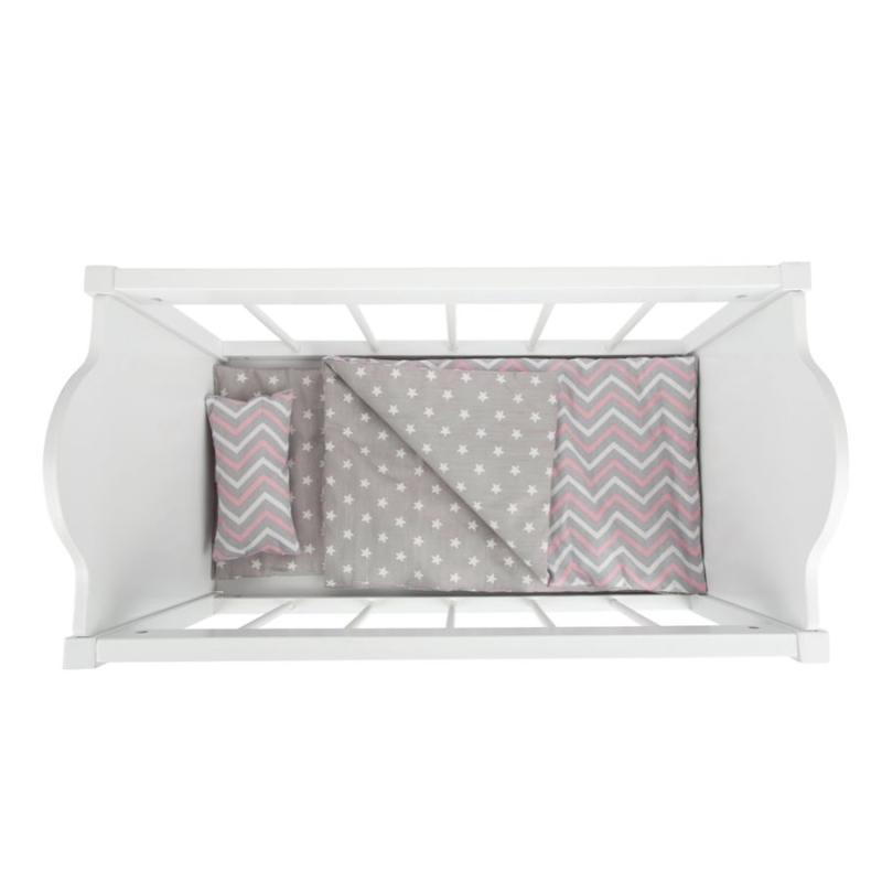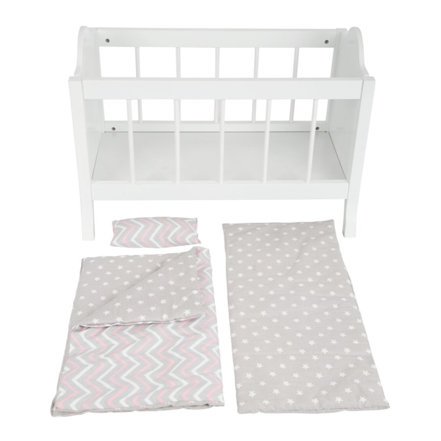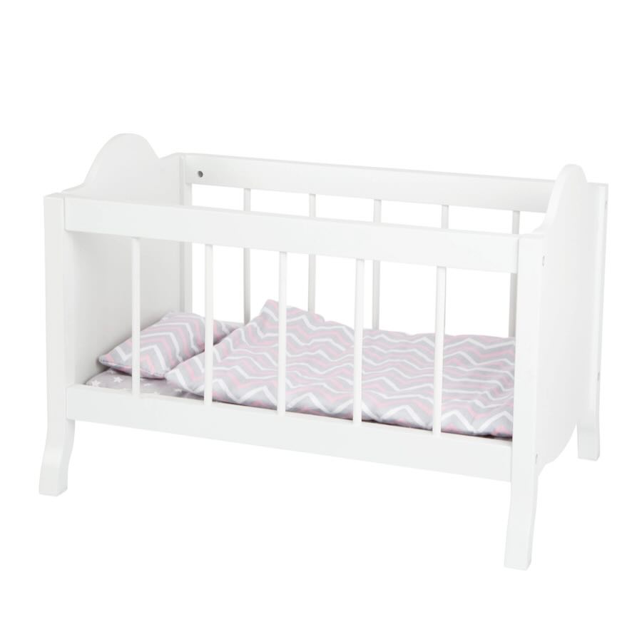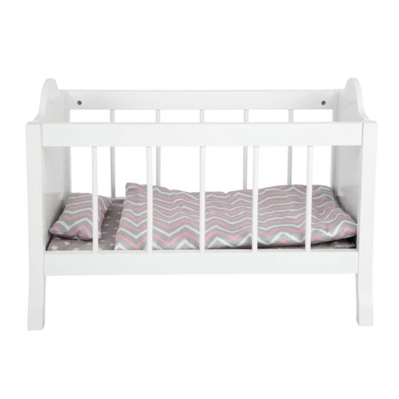 Snygg stilren docksäng i vitt trä. Särskilt bra för dockor och gosedjur eftersom de inte kan falla ut. En mjuk madrass, täcke och kudde gör det mysigt att sova i sängen. Sängkläderna är vändbara. För dockor och gosedjur upp till ca 47 cm långa. En fantastisk säng för alla små dockföräldrar. Mått ca L 47 cm.