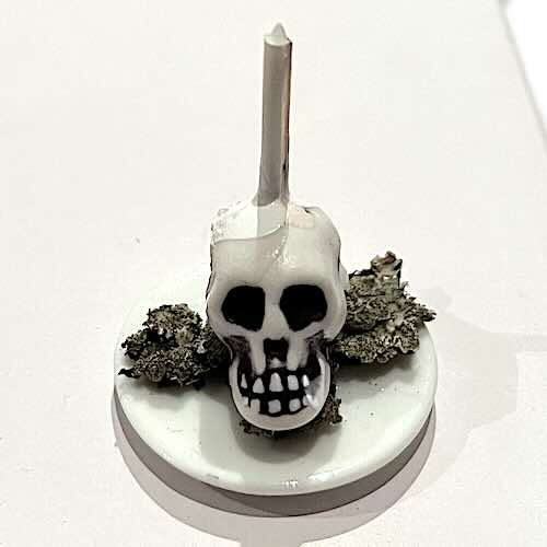 En läskig döskalle-ljusstake på fat. Perfekt för halloween och spök-projekt! Mått fatet ca B 3 cm. Alla ser lite olika ut då de innehåller handgjorda delar. Design och tillverkning Dockbutiken.