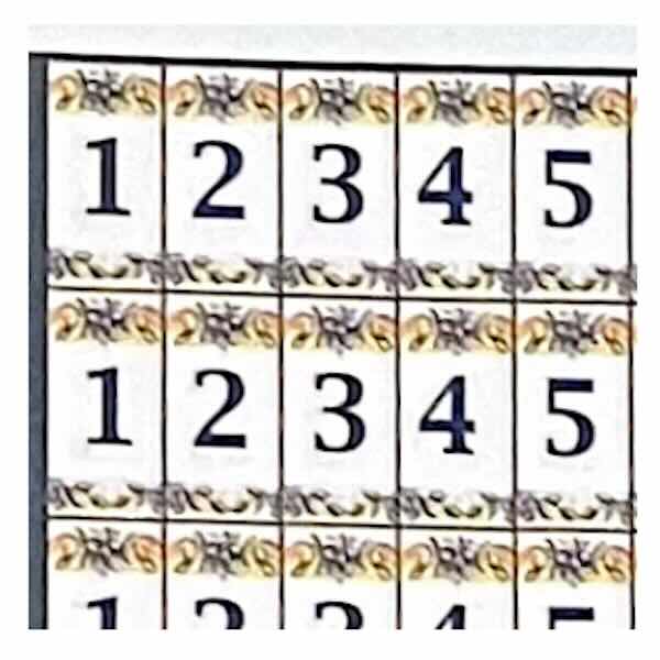 Stansat/präglat kartongark där du klipper ut/skär ut den du önskar. Mått en ruta med siffra/bokstav B 1cm x H 1,7 cm. De går utmärkt att placera siffror och bokstäver bredvid varandra som man önskar. I sydeuropeisk stil som ska se ut som kakelplattor.