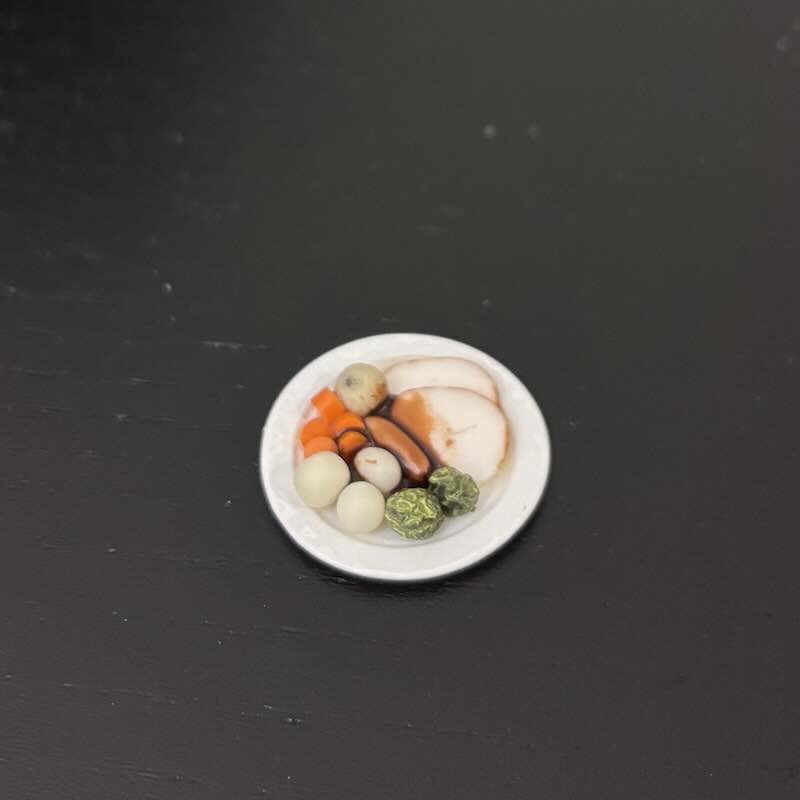 En generös mattallrik med läcker middag: kött/skinka, korv, potatis och grönsaker. Maten är handgjord och handmålad och sitter fast på tallriken (som är pressad papp/kartong). Mått tallriken B 2,5 cm