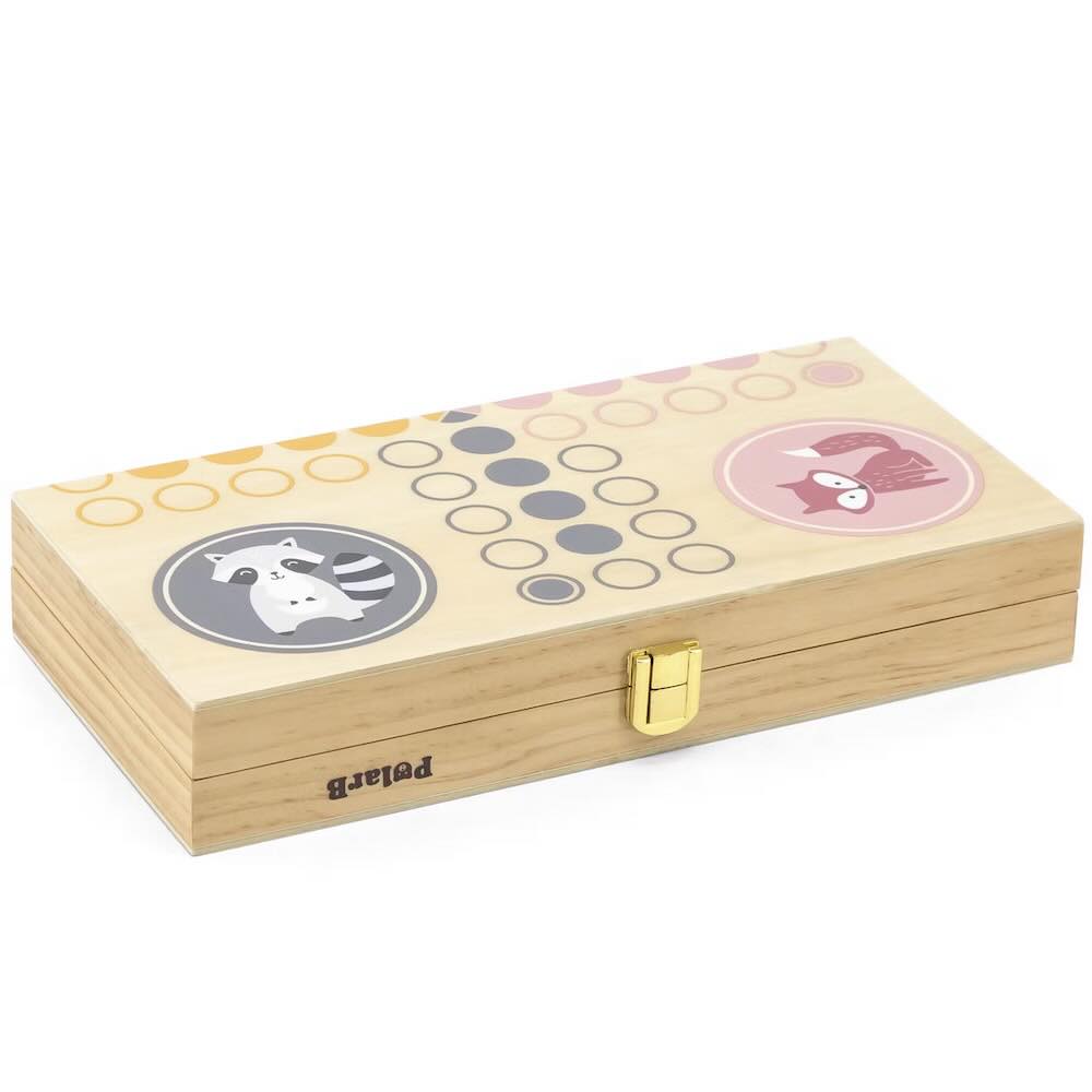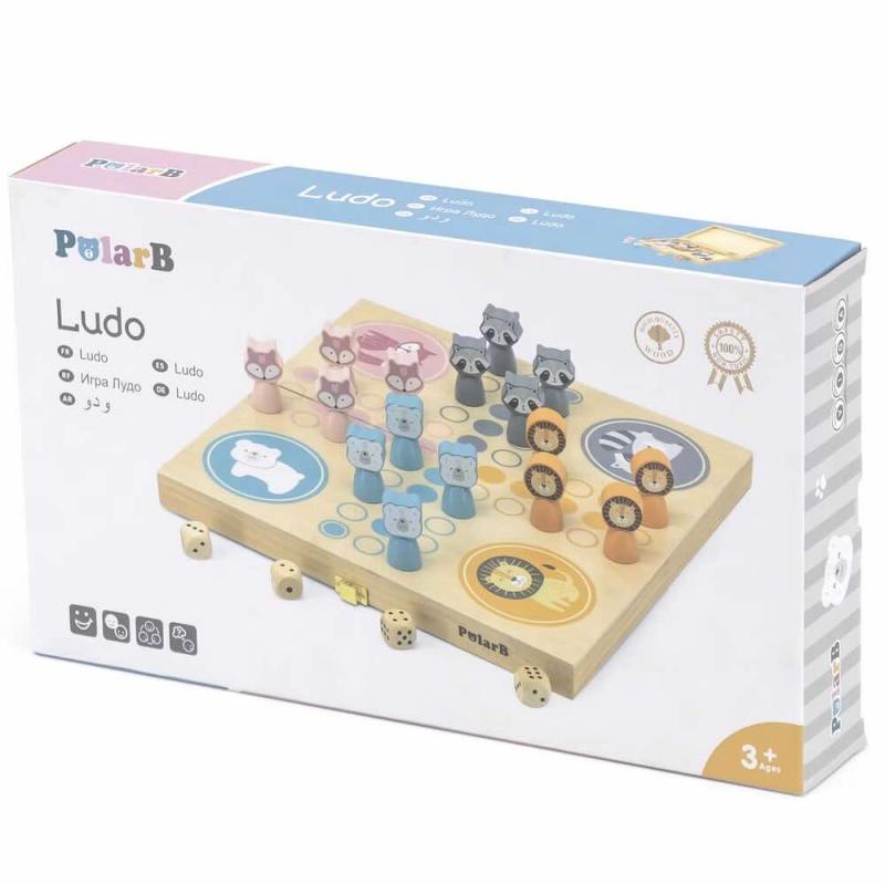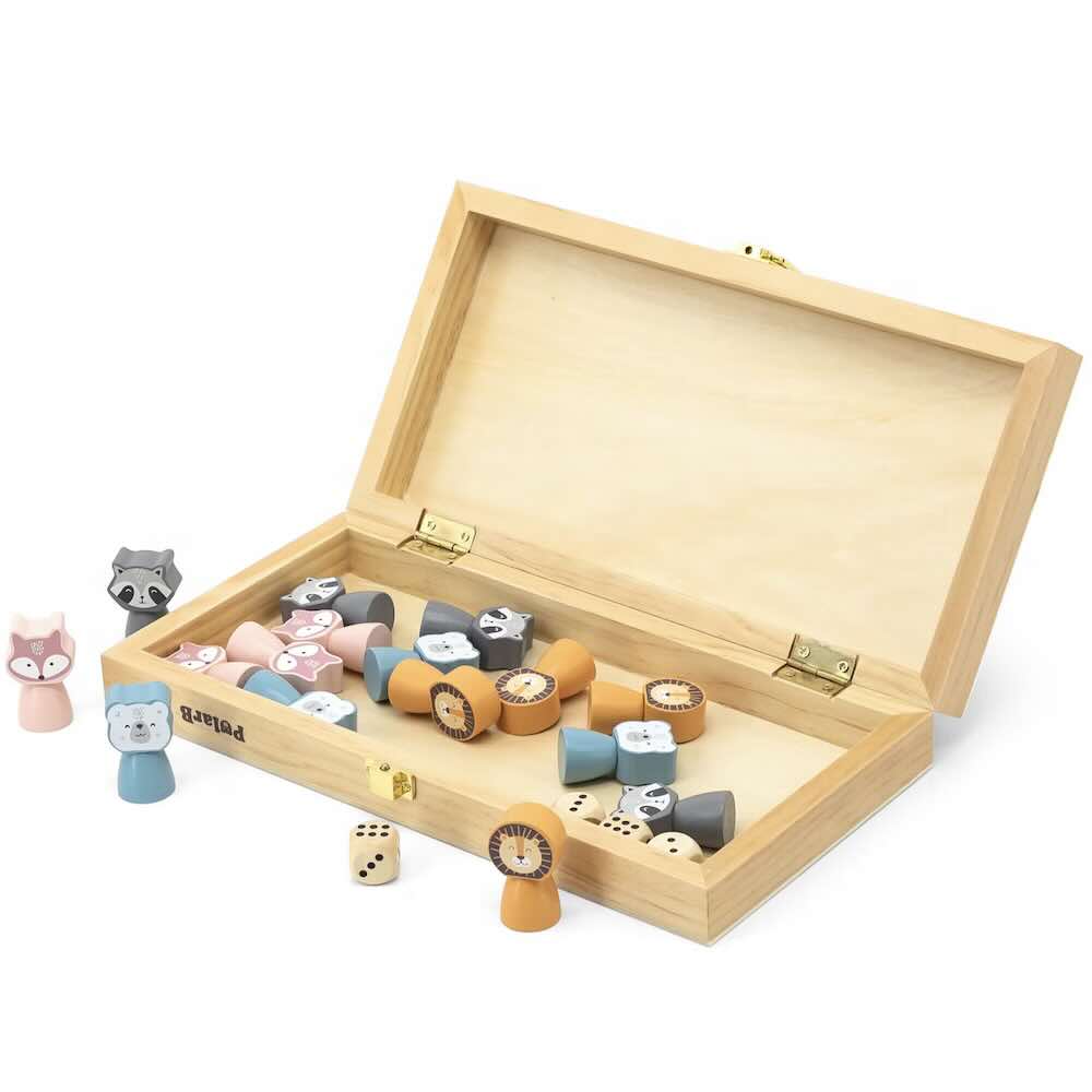 Öppna den snygga trälådan och vänd på den för att få fram spelplanen. Spelet kommer komplett med 16 charmiga träfigurer (4 av varje djur) och fyra tärningar – redo att skapa kaos och skratt.