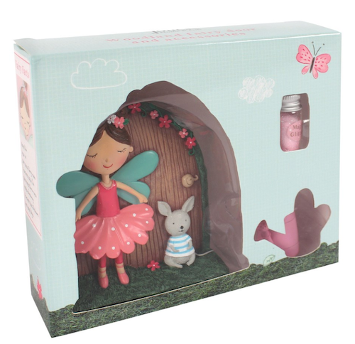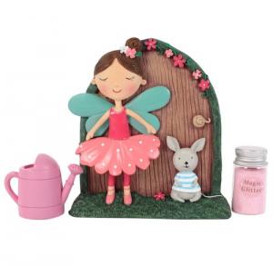 Älvan Fleur och hennes kompis musen Marvin står framför sin dörr, med vattenkanna i metall och liten glasflaska med glittermagi. Tillverkad i handmålad keramisk resin. Passar från 3 år pga smådelar. Mått ca H: 15cm x B: 18cm x D: 5cm. Kommer i fin presentask.