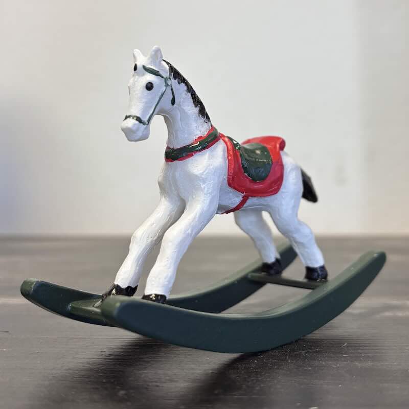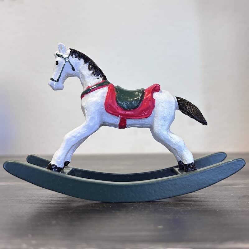 En söt detaljerad gunghäst för barnen i dockhuset, mått ca h 7,5 x b 10,5 cm. Tillverkad i keramisk polyresin