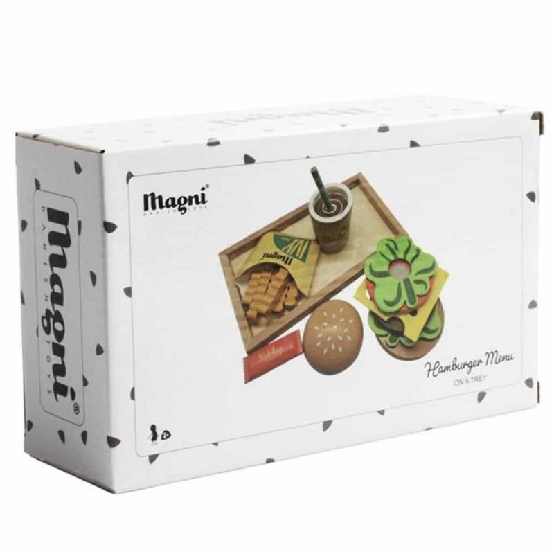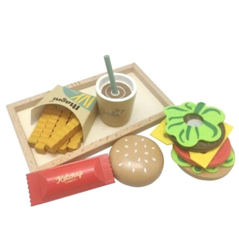 Ett komplett hamburgermeal för den hungrige! Med vårt smarriga hamburger–meal lär du inte bli hungrig på många timmar! Här finns allt du kan önska på en hamburgare. Självklart ingår det både dricka och pommes för extra lyx. Leksetet är i trä och filt så att man kan bygga sin egen burgare. Mått ca: 7 x 20 x 12.5 cm. Passar från 3 år.