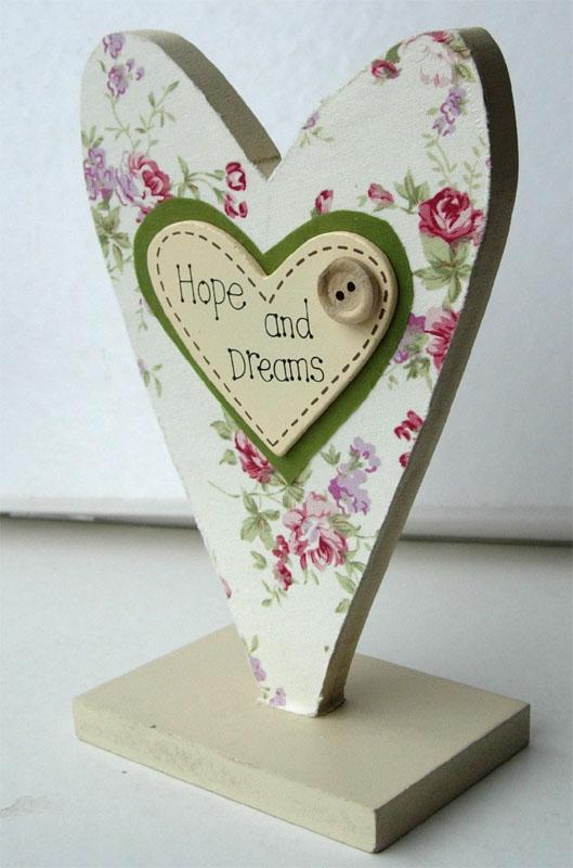 Mycket dekorativt hjärta i lantlig shabby chic stil / country kitchen. Vackert i ett fönster eller vid fotografier t ex. Gjort i trä, med rosor, text och dekorationer. Direkt från England. Mått ca: bredd 12 cm x höjd ca 19 cm.