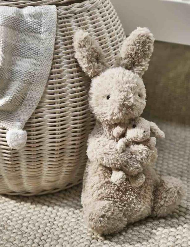En förtjusande och gosig förälder med sin lilla baby, de båda kaninerna har aningen rufsig varmt beige päls och långa, spetsade öron. Försöker den lilla ungen komma loss för att få till lite extra lektid innan läggdags, eller har det lilla yrvädret precis blivit infångad i mammans eller pappans famn för en riktigt ordentlig kram? Vad det än är så får du säkert vara med på kram-kalaset! För lite äldre barn kan den lilla kaninen klippas loss och lekas med separat om ni vill. Tillverkad av 100% polyester och handtvättas samt plan- eller hängtorkas vid behov. Mått ca H 33 cm (inkl öron). Passar från nyfödd dvs +0 månader.