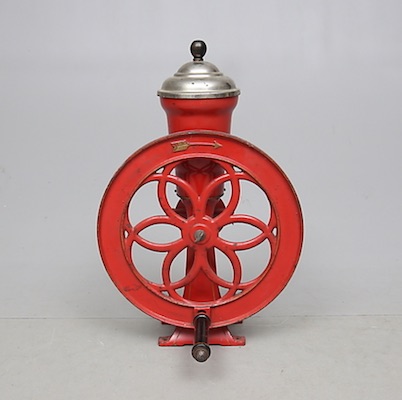 En fin klassisk kaffekvarn i rödlackerad metall med svartmålade detaljer, hjulen går att röra. En klassiker liknande Huskvarnas kaffekvarn från början av 1900-talet (se bild 2) som fanns i butiker, caféer och konditorier. Mått ca H 4 cm