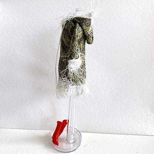 Snygg kappa i "olivgrönt/grått ormskinn" med pälskrage och huva. Röda högklackade stövlar ingår. Kappan har kardborreknäppning fram. Passar Barbie m fl fashion dolls