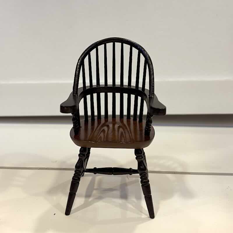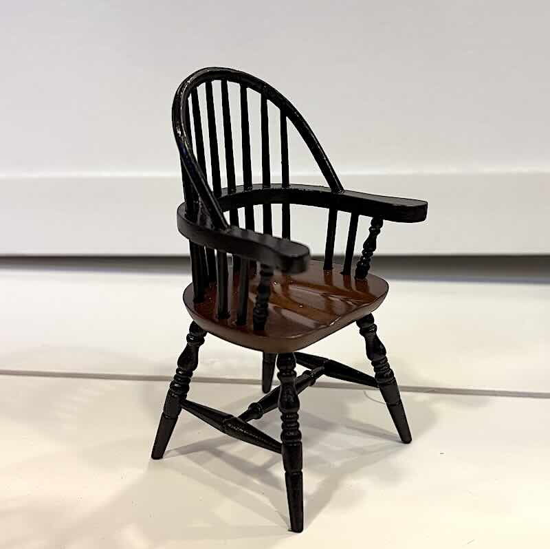 Mycket snygg karmstol av hög kvalitet. Tillverkad i svartlackerad och brunlackerat trä. Mått ca H 9 cm, sitthöjd ca 4,8 cm.