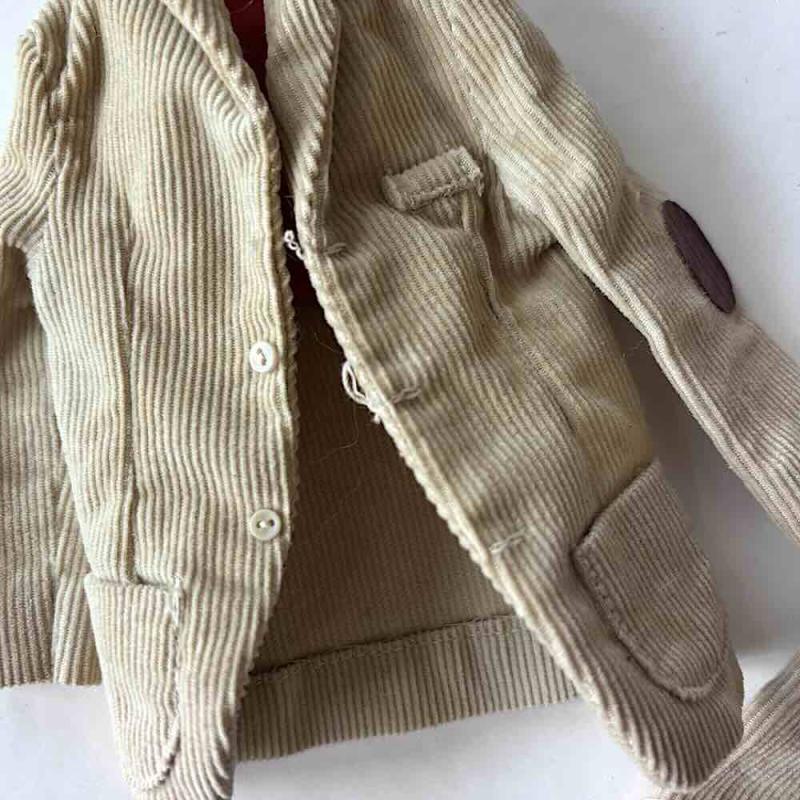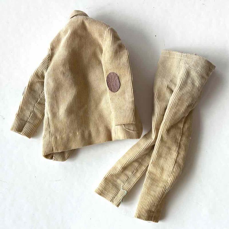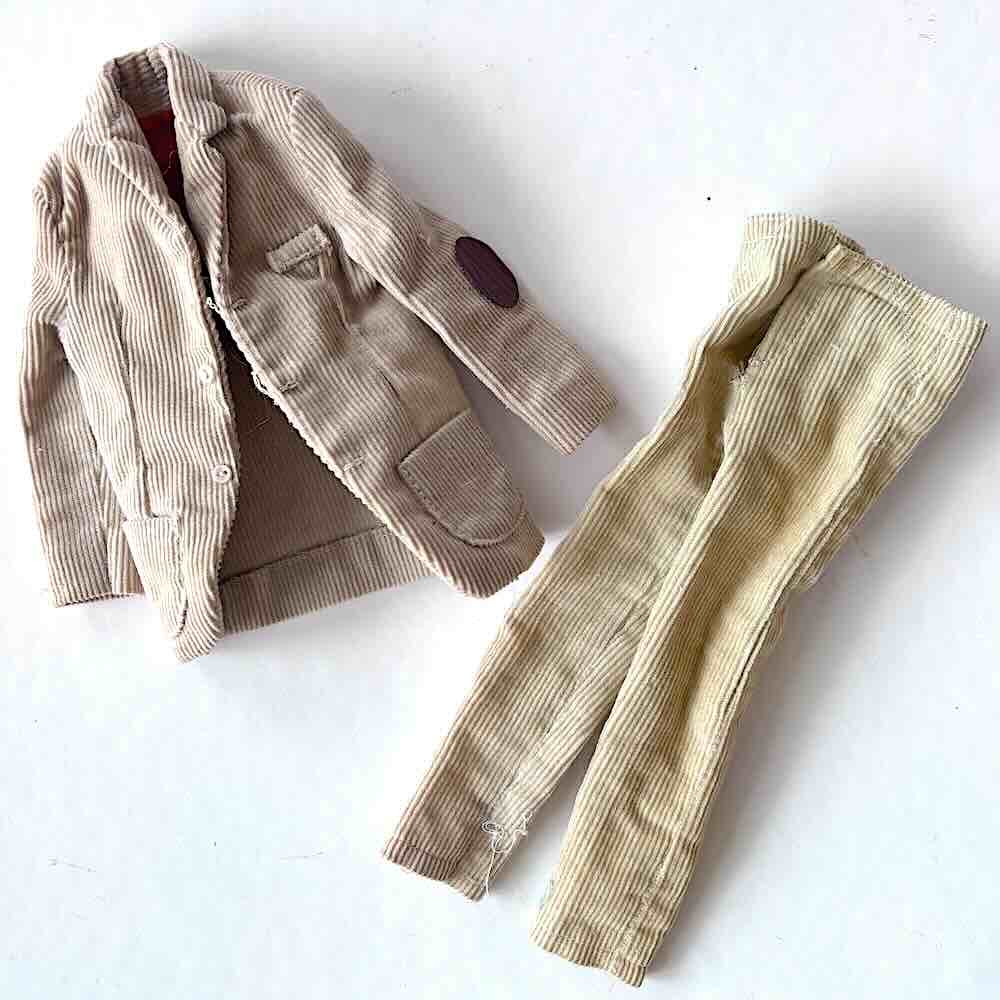 Komplett set Ken #1410 Campus Corduroys från !964-1965 i fint skick. Saknas översta knappen i kavajen, för övrigt i fint lekt skick. Snygg manchesterkostym i beige/ljusbrunt med klassiska "mockalappar" på armbågarna på kavajen.