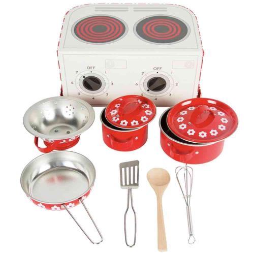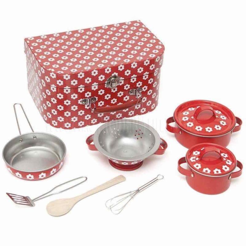 En väska (tillverkad i hård kartong med metallspännen) full med skojiga matlagningsgrejer, kastruller, vispar, allt som är med på bilden. Dessutom kan väskan användas som spis. Perfekt att ha med sig när det är dags att leka! Mått väskan ca B 24 x D 13 x H 16 cm